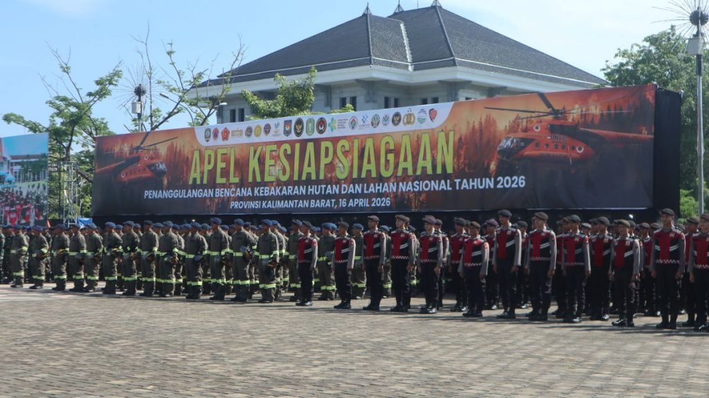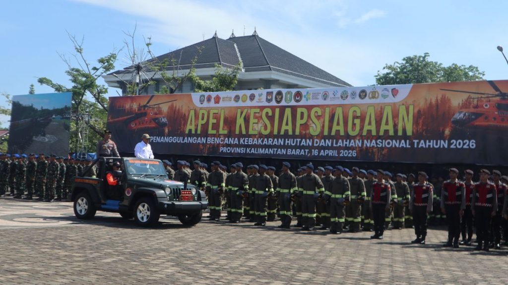 Pontianak-Apel Kesiapsiagaan Penanggulangan Bencana Kebakaran Hutan dan Lahan (Karhutla) Nasional Tahun 2026 digelar di Halaman Kantor Gubernur Kalimantan Barat pada Kamis, 16 April 2026. Apel dipimpin langsung oleh Menteri Koordinator Bidang Politik, Hukum, dan Keamanan Republik Indonesia, Djamari Chaniago, serta dihadiri oleh sejumlah pejabat tinggi negara dan pimpinan lembaga terkait.